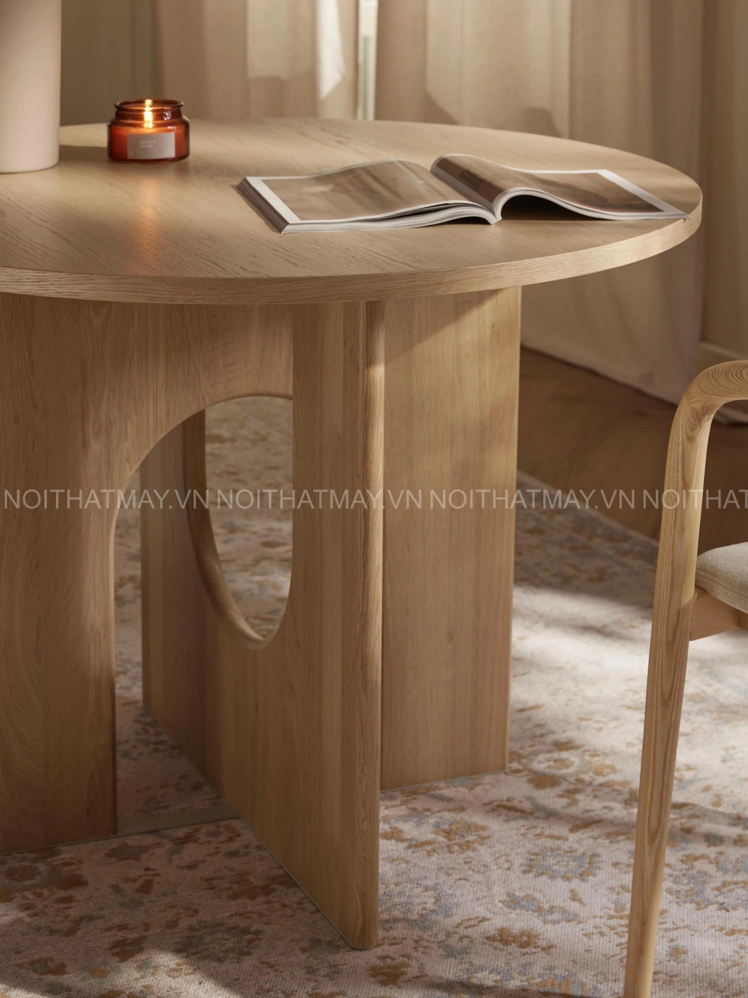 Mặt bàn được chế tác từ gỗ Sồi (Oak) tự nhiên tuyển chọn, nổi bật với những đường vân gỗ sắc nét và uốn lượn tràn đầy sức sống. Bề mặt bàn được xử lý tỉ mỉ, bo nhẹ các cạnh mang lại cảm giác an toàn và mượt mà khi chạm vào, đồng thời giữ được trọn vẹn vẻ đẹp thô mộc nhưng sang trọng của gỗ sồi cao cấp.
