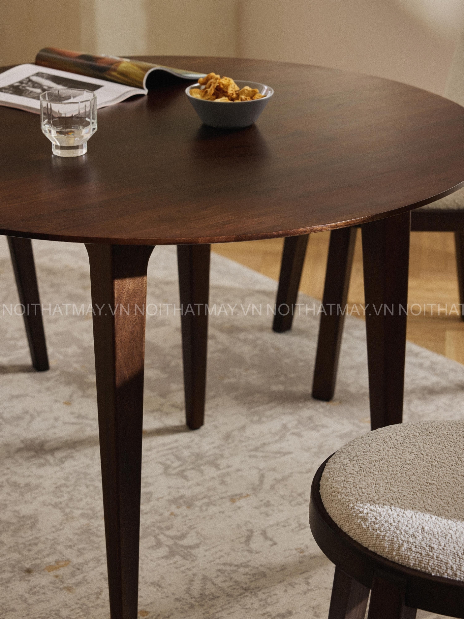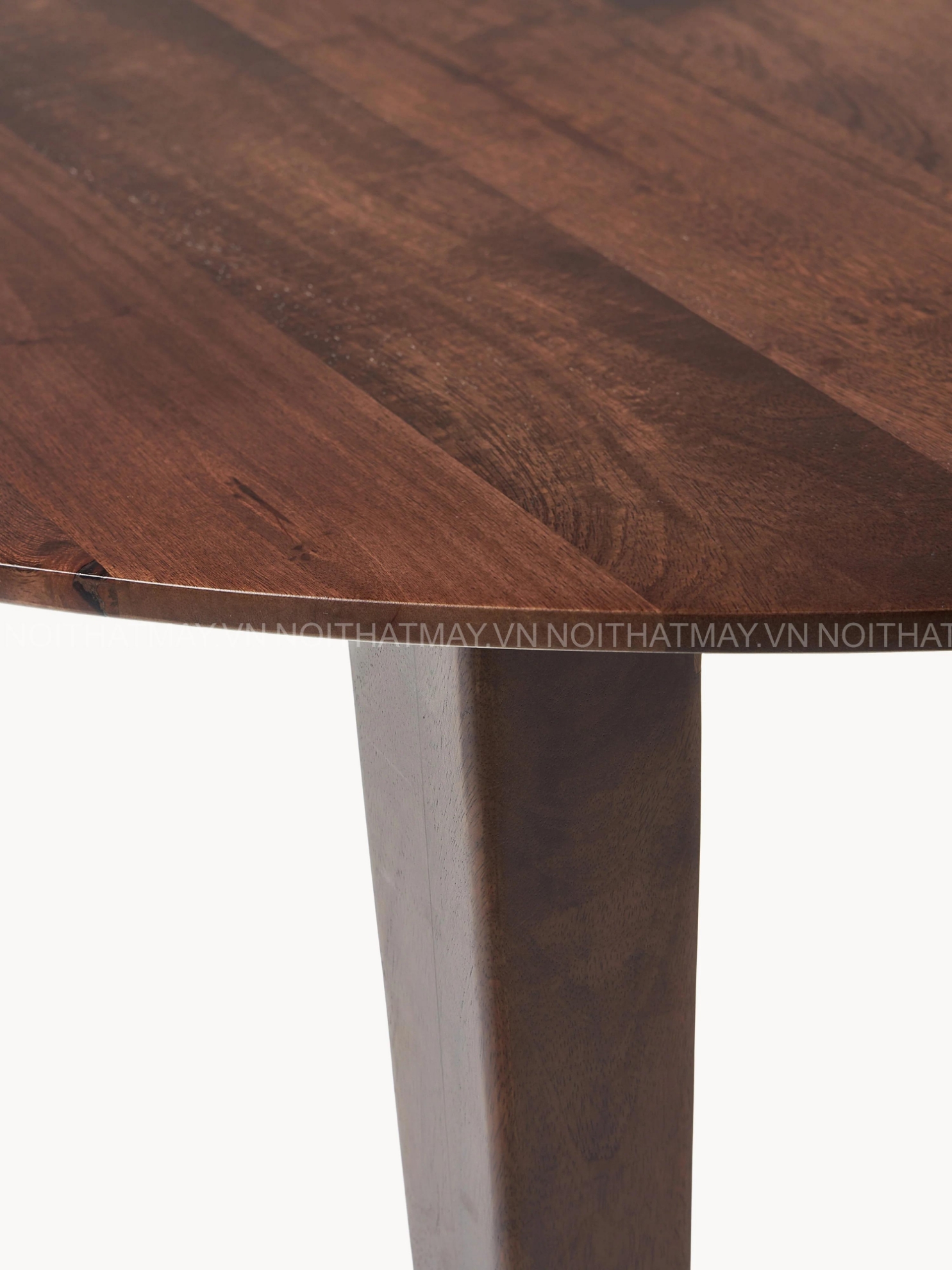 • Kiểu dáng chân thon gọn: Chân bàn được tiện tròn một cách tỉ mỉ, thuôn nhỏ dần về phía dưới tạo diện mạo nhẹ nhàng, thanh thoát nhưng vẫn cực kỳ vững chãi. Đây là điểm nhấn giúp chiếc bàn thoát khỏi sự thô cứng của các dòng bàn gỗ thông thường.