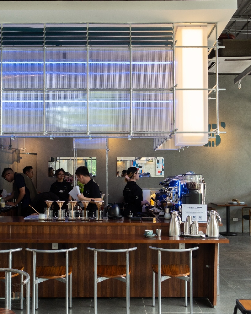 Tại dự án Smore Thành Thái, khái niệm "nội thất đại trà" hoàn toàn bị loại bỏ. Tất cả các sản phẩm từ: Bàn ghế, hệ quầy bar, khung kệ trang trí đến hệ đèn quầy Mica... đều được Mây sản xuất đồng bộ và thiết kế riêng biệt (Custom-made) theo kích thước thực tế của mặt bằng.