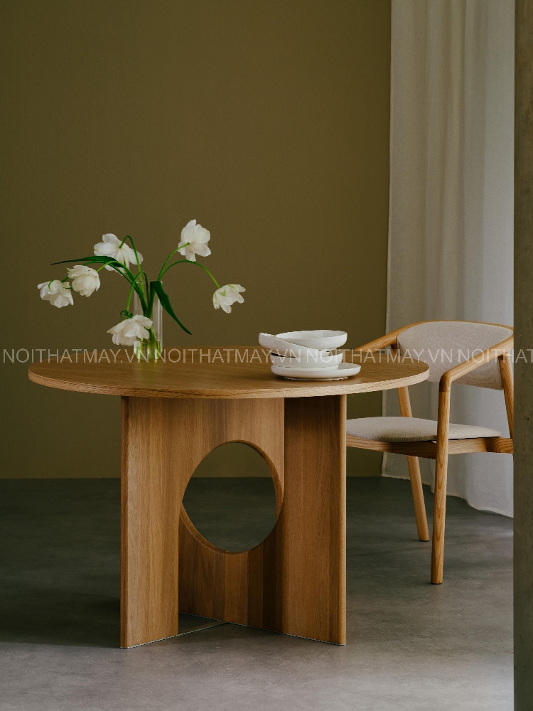 Điểm nhấn nằm ở chân bàn khoét tròn – chi tiết hình học tạo cảm giác nhẹ, thoáng nhưng vẫn vững chắc về kết cấu.