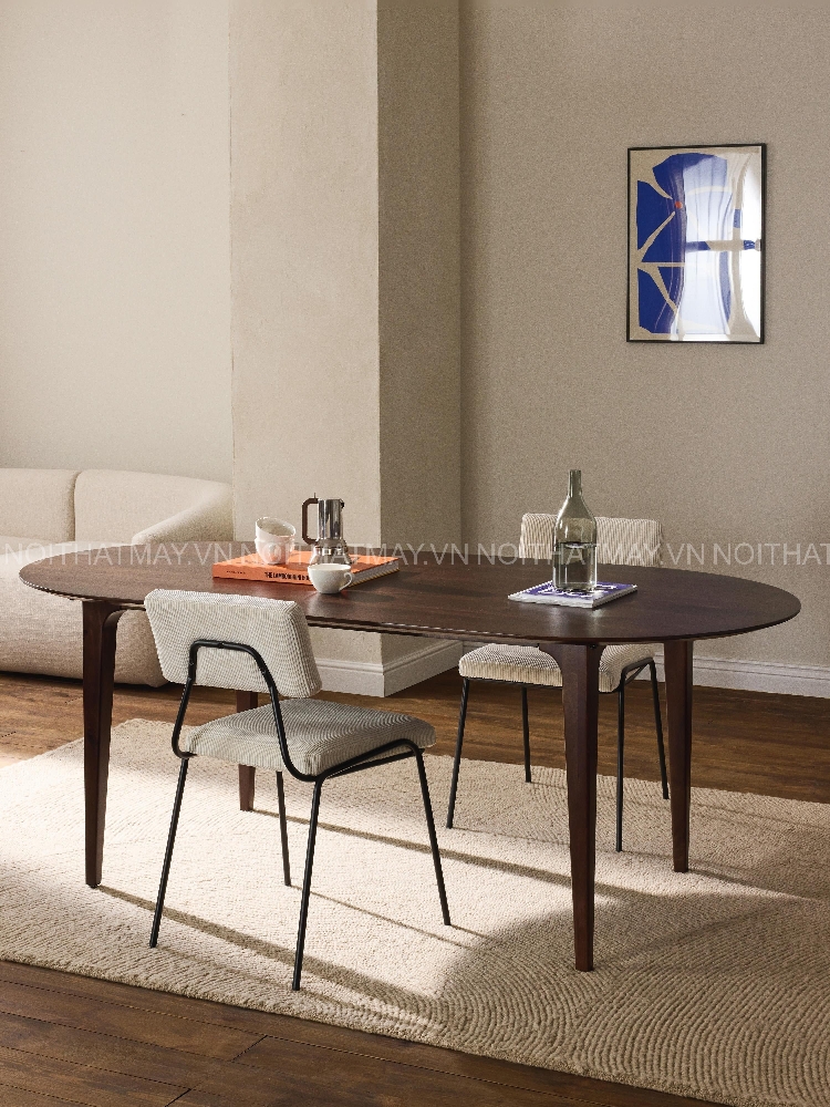Mặt bàn oval bo mềm, cân bằng giữa thẩm mỹ và trải nghiệm sử dụng hằng ngày.