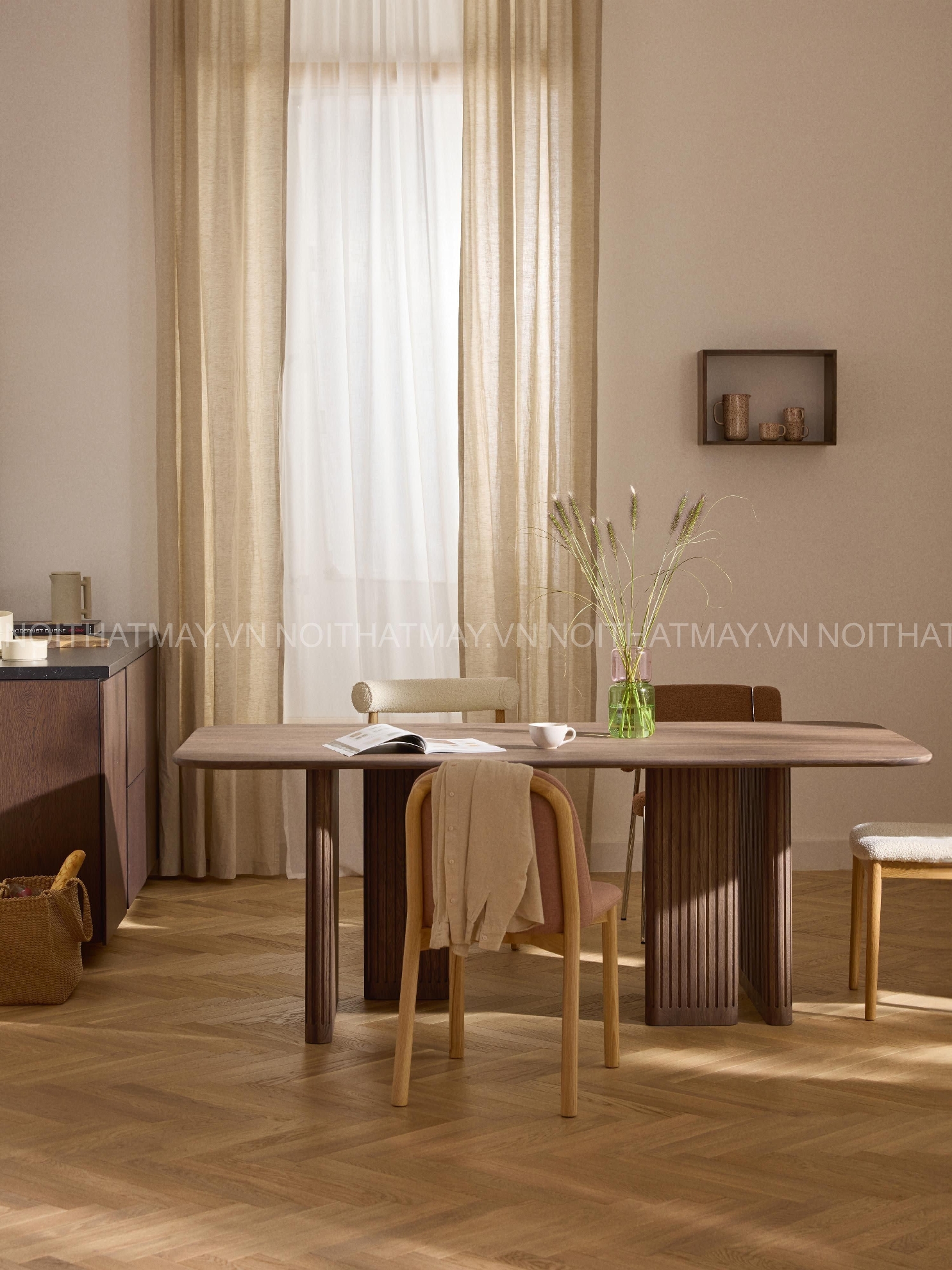 Toàn bộ bàn sử dụng gỗ sồi tự nhiên, giữ trọn vân gỗ mộc và sắc sáng ấm, càng dùng càng đẹp.
