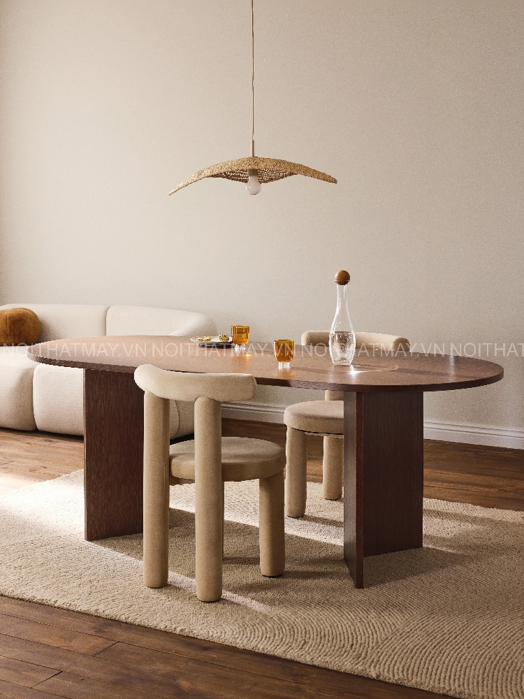 Toni được tạo hình từ những đường cong mềm và tỷ lệ rất “đúng”: mặt bàn oval thanh thoát, bo cạnh nhẹ để ánh sáng trượt êm trên bề mặt gỗ. Phần chân bản đứng vững nhưng được tiết chế độ dày, tạo cảm giác chắc chắn mà không thô nặng.
