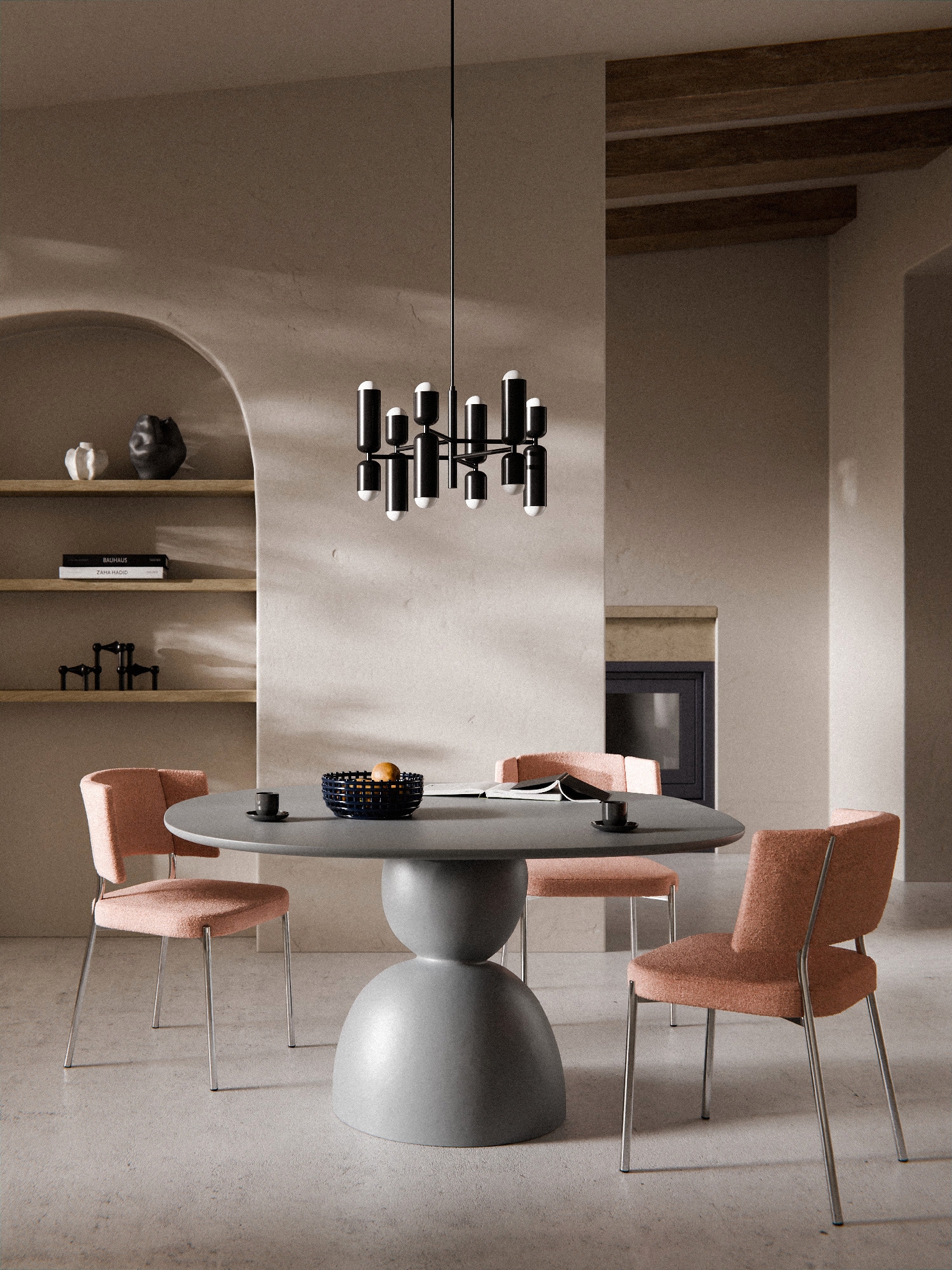 Điểm đắt giá nằm ở chân trụ tròn khối lớn, đặt lệch nhẹ theo trục bàn → tạo cảm giác vững chãi mà vẫn có nhịp điệu thị giác.