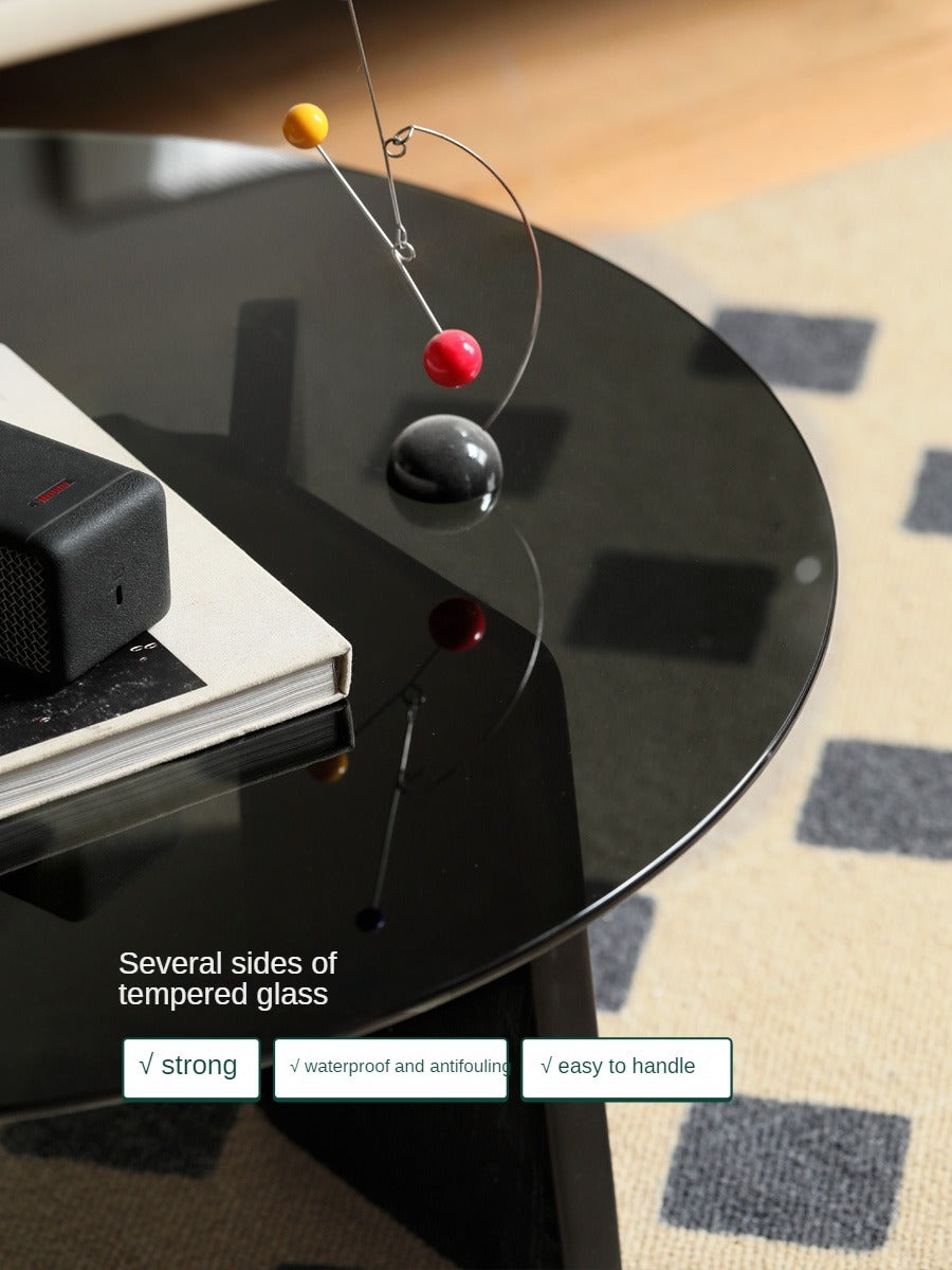 Mặt bàn được làm từ kính cường lực cao cấp, mang lại vẻ đẹp bóng bẩy, sang trọng. Khả năng chịu lực tốt và dễ dàng vệ sinh giúp bàn luôn như mới. Phần chân bàn được chế tác từ gỗ công nghiệp cao cấp, phủ sơn bóng đen mượt mà, thể hiện sự đẳng cấp và bền bỉ. Sự phối hợp giữa màu đen và chi tiết vàng kim loại tạo nên sự tương phản mạnh mẽ, làm nổi bật không gian phòng khách.